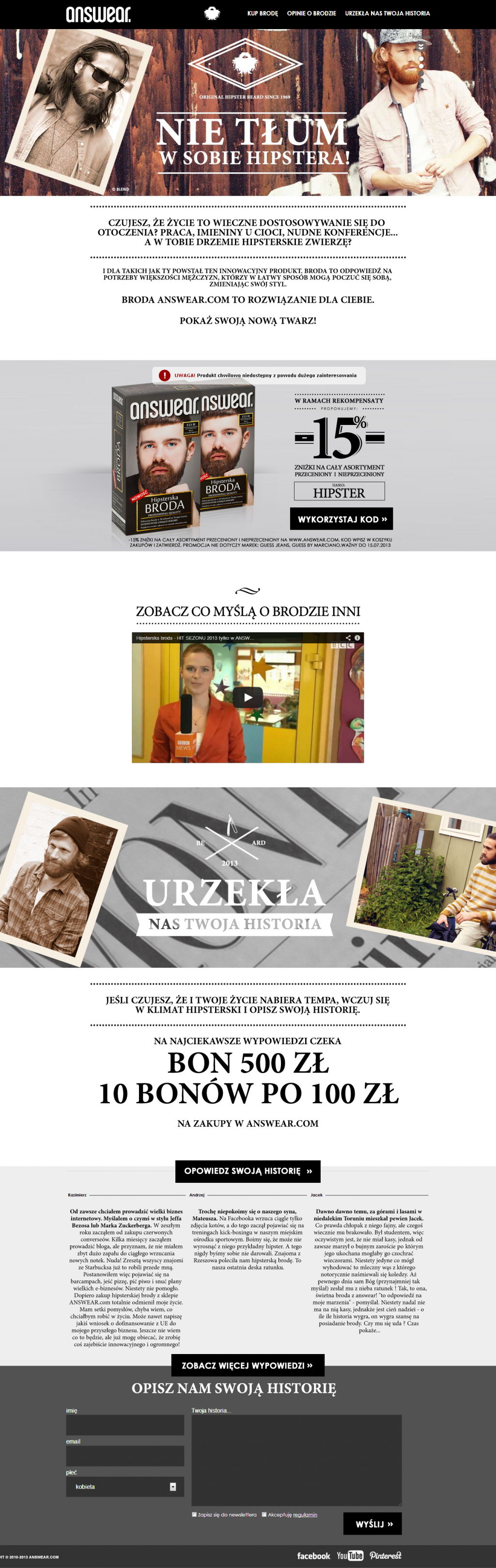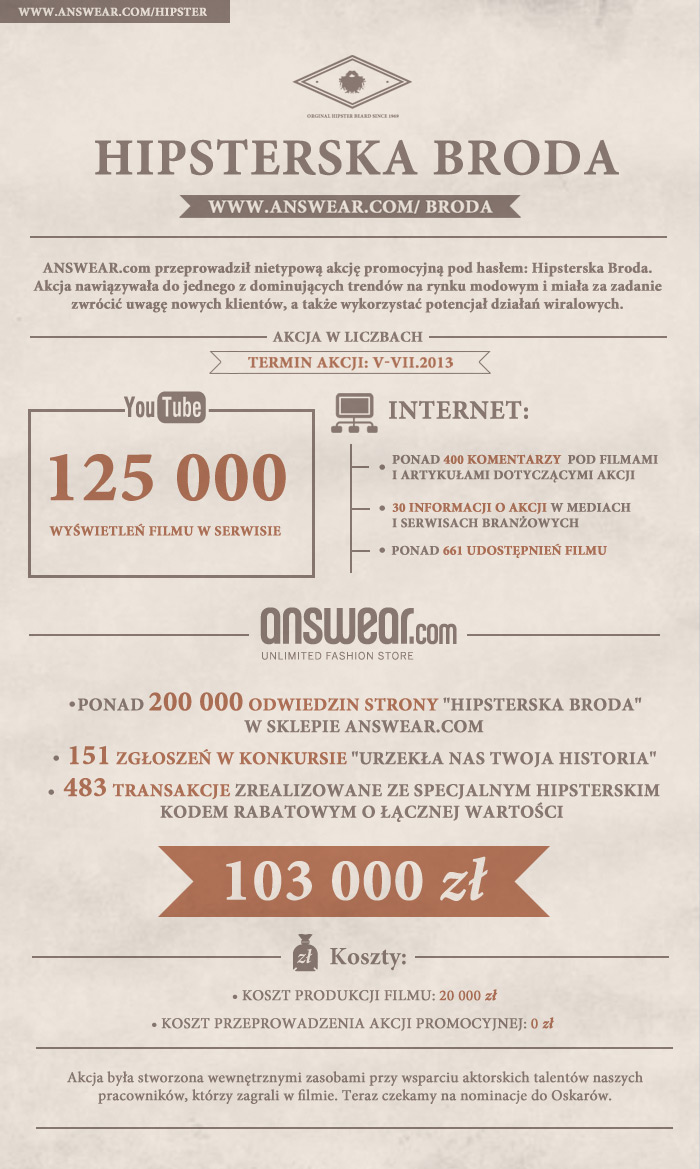 Strona dedykowana akcji: answear.com/hipster została odwiedzona ponad 200 000 razy, przynosząc prawie 500 transakcji dokonanych przez użytkowników na łączną kwotę 103 000 zł. Cały proces przygotowania akcji od momentu pojawienia się pomysłu do powstania ostatecznej wersji filmu trwał mniej więcej 2 miesiące.