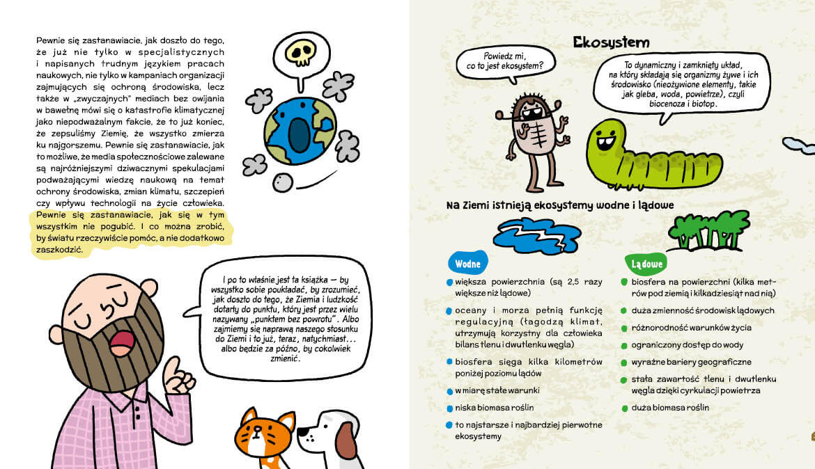 Autor książki – Tomasz Samojlik jest dr. hab. nauk biologicznych, autorem wielu książek i komiksów, który popularyzuje naukę i postawy proekologiczne zarówno wśród starszych, jak i młodszych czytelników. Publikacja w niezwykle ciekawy, przystępny, a jednocześnie ambitny sposób przybliża dzieciom i młodzieży szkolnej zagadnienia z zakresu ekologii, biologii, zmian klimatycznych czy szeroko rozumianej ochrony środowiska. Na bazie rysunków, schematów, infografik czy komiksów objaśnia zagadnienia i podpowiada, jak małymi krokami i we własnym zakresie można pozytywnie wpływać na otoczenie.