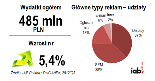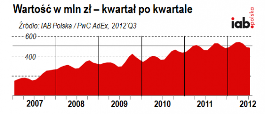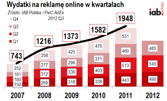 Pomimo ciągłych spadków na wydatki reklamowe w prawie wszystkich mediach, rynek online nadal rośnie, osiągając po trzech kwartałach 2012 już 18,9% całego tortu reklamowego w Polsce (za Starlink). Według AdEx reklama online w sumie w tym roku zarobiła już 1,52 miliarda i wszystko wskazuje na to, że pomimo trudnej sytuacji na rynku mediowym, rok 2012 przyniesie dla reklamy cyfrowej rekordową wartość.