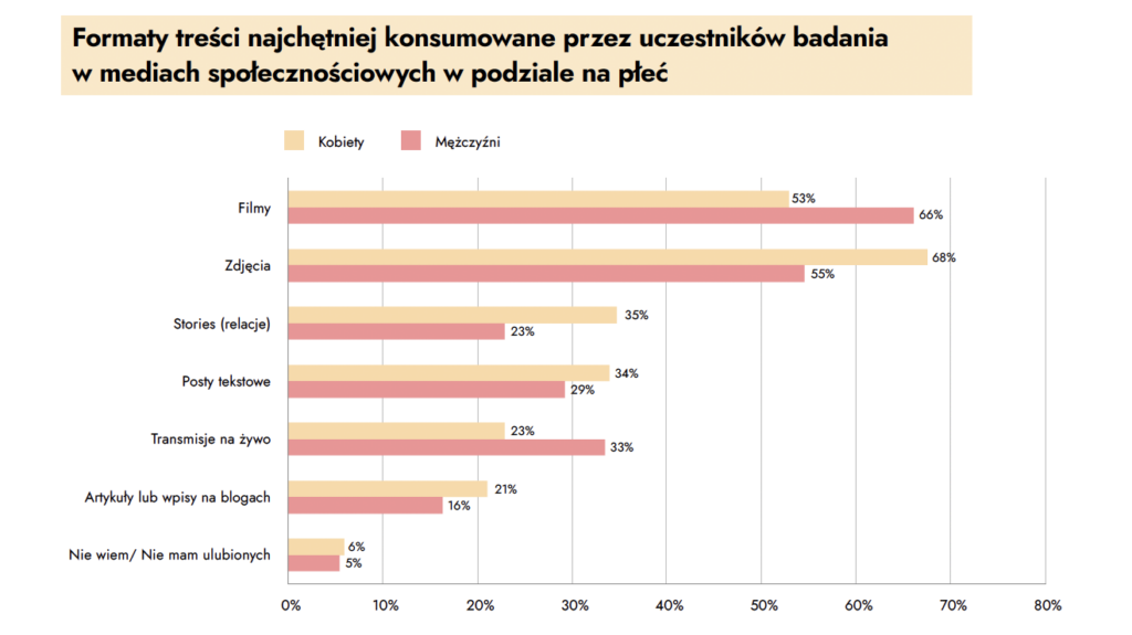 - Mężczyźni częściej wybierają zdjęcia, a także nieco chętniej niż kobiety oglądają relacje na żywo.