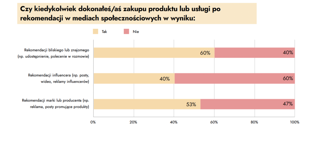 Wyniki badania pokazują, że rekomendacje są jednym z kluczowych elementów kształtujących decyzje zakupowe w mediach społecznościowych. Użytkownicy nie tylko aktywnie szukają opinii innych, ale też w dużej mierze im ufają.