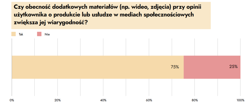 - 75% respondentów wskazało, że obecność multimediów – takich jak zdjęcia, wideo czy krótkie prezentacje produktu – znacząco zwiększa wiarygodność opinii. Autentyczne, wizualne treści pozwalają użytkownikom szybciej ocenić produkt i łatwiej podjąć decyzję.