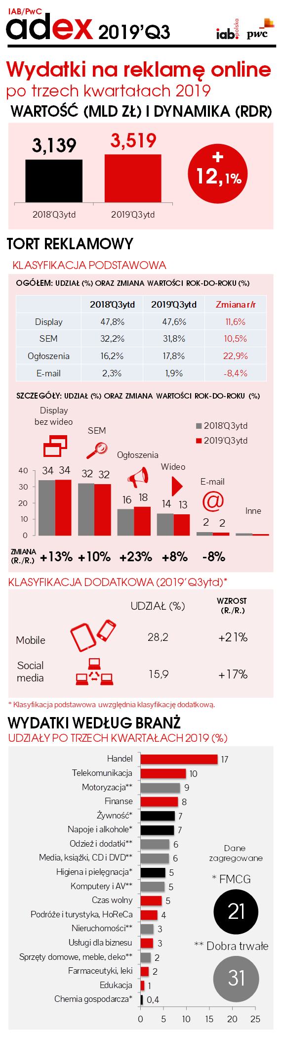 Po trzech kwartałach 2019 roku nakłady na reklamę online wzrosły o prawie 380 mln zł względem porównywalnego okresu roku wcześniejszego, dzięki czemu ich całkowita wartość osiągnęła 3,5 mld zł. Przełożyło się to na dynamikę rok do roku na poziomie 12%.