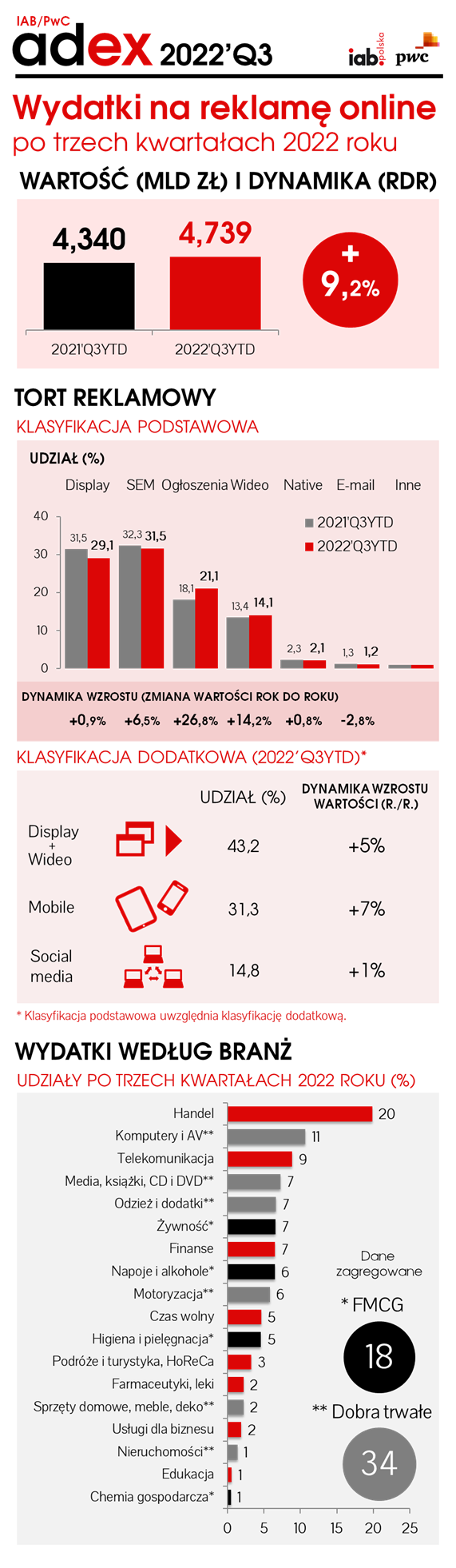 Związek Pracodawców Branży Internetowej IAB Polska publikuje wyniki badania wartości wydatków na reklamę internetową – IAB Polska/PWC AdEx. W trzecim kwartale 2022 roku tempo rozwojowe nieco wyhamowało względem wcześniejszego trymestru (12%), osiągając indeks wzrostu na poziomie 6,2%. Przełożyło się to na dynamikę na poziomie 9,2% w okresie styczeń-wrzesień.