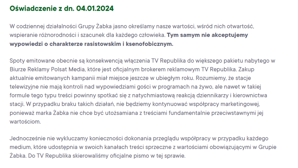 4 stycznia br. na oficjalnej stronie internetowej sklepu Żabka pojawiło się oświadczenie dotyczące sytuacji w Telewizji Republika. Marka odcina się w nim od kanału telewizyjnego i zaznacza, że „nie akceptuje wypowiedzi o charakterze rasistowskim i ksenofobicznym”.