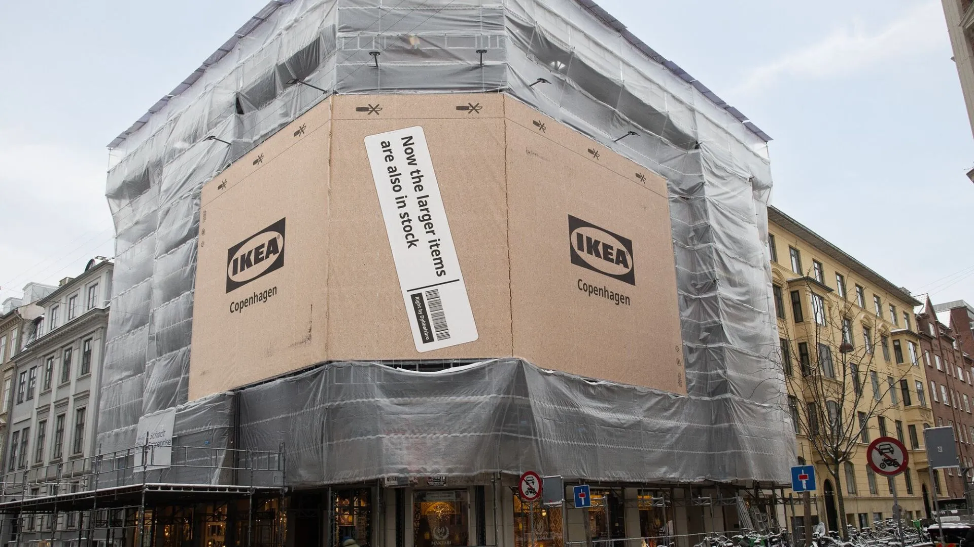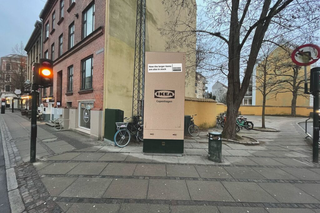 IKEA przekształciła ulice Kopenhagi w ogromnej skali kampanię outdoorową „Flat-Pack City”. Pokryła budynki, autobusy oraz miejskie przystanki grafiką przypominającą kartonowe pudełka. Wszystko po to, by zakomunikować, że większe produkty są już dostępne od ręki w sklepie w centrum miasta.