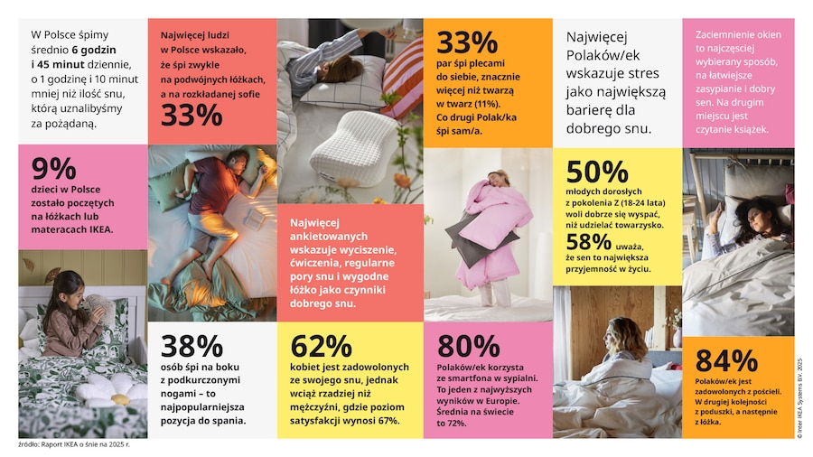 Z raportu IKEA wynika m.in., że Polacy śpią średnio 6 godzin i 45 minut dziennie. To o 1 godzinę i 10 minut mniej, niż byśmy chcieli, ale mimo tego należymy do czołówki zadowolonych Europejczyków. Najlepszy wynik pod tym względem na świecie uzyskali Chińczycy, spośród których aż 82% zadeklarowało, że budzi się wypoczętych.