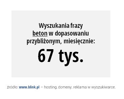 Dodatkowo Blink.pl sprawdził, które materiały budowlane należą do najczęściej poszukiwanych w internecie. Liderem zestawienia okazał się być „beton” – frazy związane z tym słowem wpisywane są w wyszukiwarkę średnio 67 tys. razy miesięcznie! Za wyświetlenie reklamy po tej frazie zapłacimy 2,08 zł netto.
