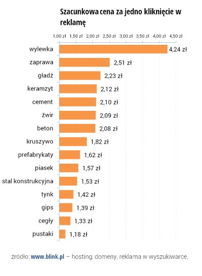 Aby oszacować koszty reklamy w wyszukiwarce Google dla branży budowlanej, Blink.pl przeprowadził symulację z podziałem na poszczególne słowa kluczowe. Sprawdzając potencjał każdego z nich okazało się, że najwięcej przyjdzie zapłacić za kliknięcie w reklamę ukazującą się po wpisaniu słowa „wylewki” – 4,24 zł netto. Co ciekawe, większość słów definiujących materiały podstawowe (np. „beton”, „żwir”, „zaprawa”, „cement” czy „gips”) – nie różni się znacznie pod kątem ogólnego kosztu kliknięcia w kampanii ogólnopolskiej. Zazwyczaj można liczyć na uzyskanie cen rzędu ok. 2 zł netto za kliknięcie.