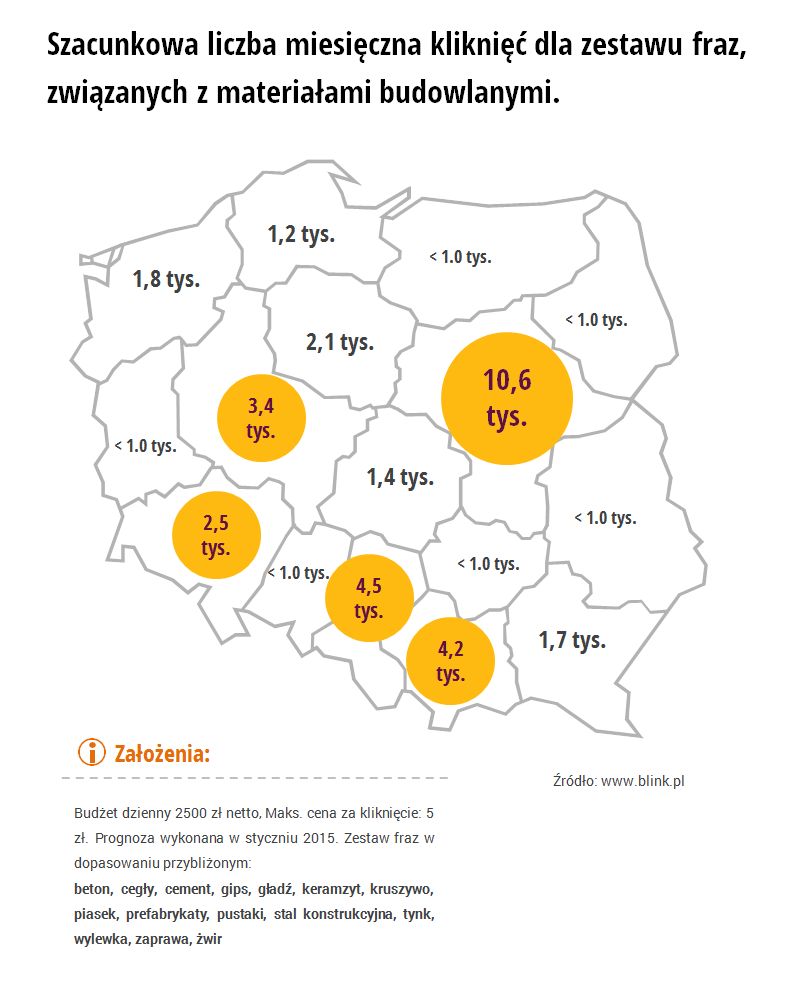 Analizując warunki determinujące reklamę AdWords w branży materiałów budowanych, Blink.pl pod uwagę wziął zestaw 15-tu fraz reprezentujących ten rynek. Wśród zbadanych słów znalazły się takie wyrażenia, jak: „beton”, „cegły”, „cement”, „gips”, „gładź”, „keramzyt”, „kruszywo”, „piasek”, „prefabrykaty”, „pustaki”, „stal konstrukcyjna”, „tynk”, „wylewka”, „zaprawa” oraz „żwir”. Założono kampanię ogólnopolską w tzw. sieci wyszukiwania obejmującej słowa z analizowanej listy (czyli reklamę docierającą do osób wpisujących frazy w okno wyszukiwarki). Badanie przeprowadzono w styczniu 2015 roku. Symulowano wyniki, jakie uzyskałby reklamodawca wydatkujący budżet dzienny w wysokości 2 500 zł netto i płacący maksymalną cenę – 5 zł netto za pojedyncze kliknięcie w reklamę. Analiza pokazała, że inwestycja na tym poziomie pozwoli osiągnąć efekt kształtujący się na poziomie 260 tys. wyświetleń reklam miesięcznie.