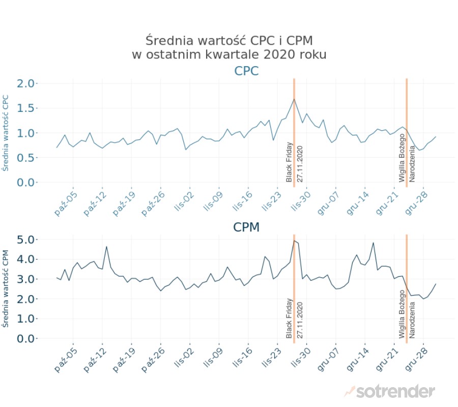 - Średni CPC w Black Friday wynosił 1 zł 70 gr – była to najwyższa wartość CPC w całym kwartale. Średni CPC w pozostałych miesiącach wynosi około 80 gr.