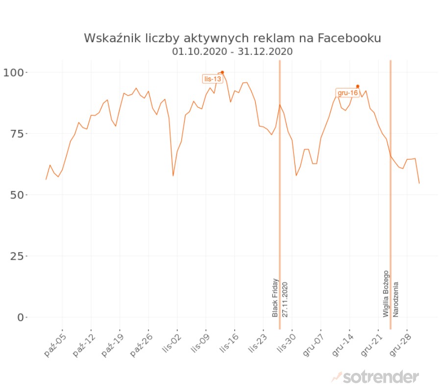 - Najwięcej aktywnych reklam odnotowaliśmy na około 2 tygodnie przed Black Friday. W sam czarny piątek ich liczba była o około 15% niższa.