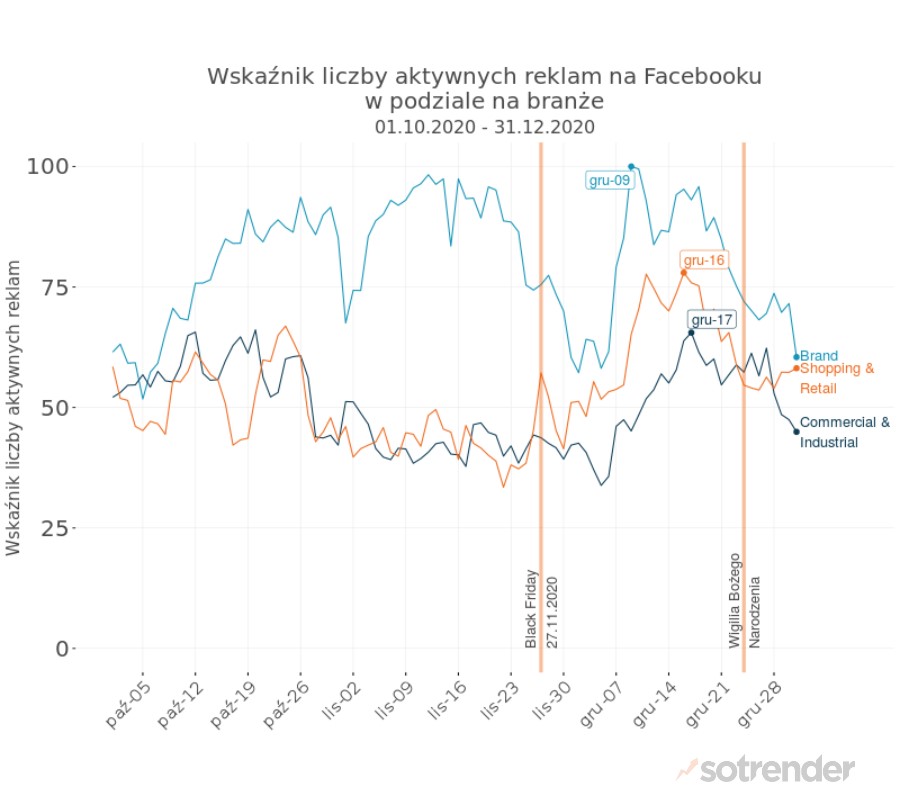Z kolei w okresie świątecznym największą aktywność reklamową w ekosystemie Facebooka odnotowaliśmy na ponad tydzień przed Wigilią. Od tej daty aktywność wyraźnie spada, a w święta Bożego Narodzenia jest już o około 30% niższa. Poniżej możemy zobaczyć, jak zmieniała się liczba aktywnych reklam w podziale na branże.
