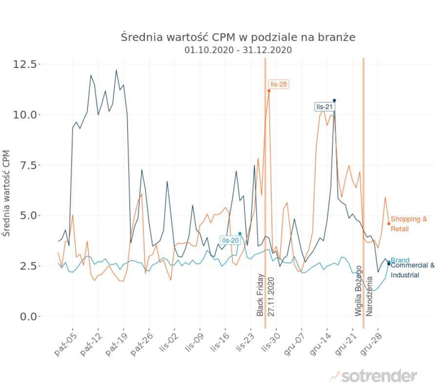 W kategorii Commercial & Industrial średni CPM przyjął dużo większą wartość na kilka dni przed Black Friday, osiągając kwotę ok. 7 zł 50 gr za 1000 wyświetleń reklamy. W okresie okołoświątecznym najwyższy średni CPM wyniósł ok. 11 zł dla kategorii Commercial & Industrial i ok. 10 zł dla Shopping & Retail, mniej więcej na tydzień przed Wigilią.