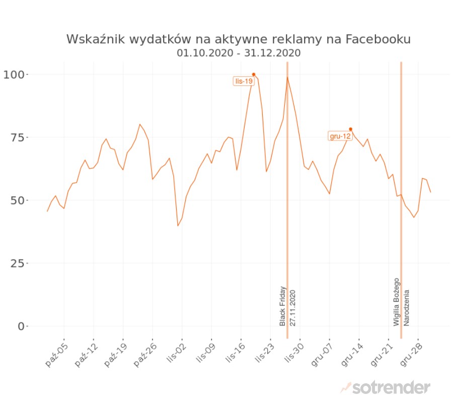 - W okresie poprzedzającym Black Friday kampanie reklamowe w ekosystemie Facebooka były najdroższe w całym Q4. Koszty reklamowe kampanii bożonarodzeniowych były znacznie niższe.