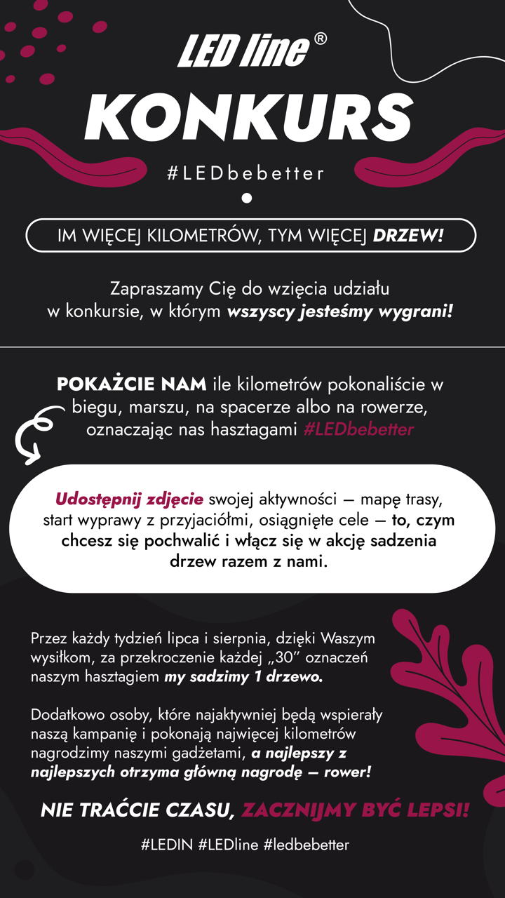 Przez każdy tydzień lipca i sierpnia, dzięki wysiłkom wszystkich uczestników, za przekroczenie każdej „30” oznaczeń hasztagiem #LEDbebetter marka LEDline posadzi 1 drzewo.