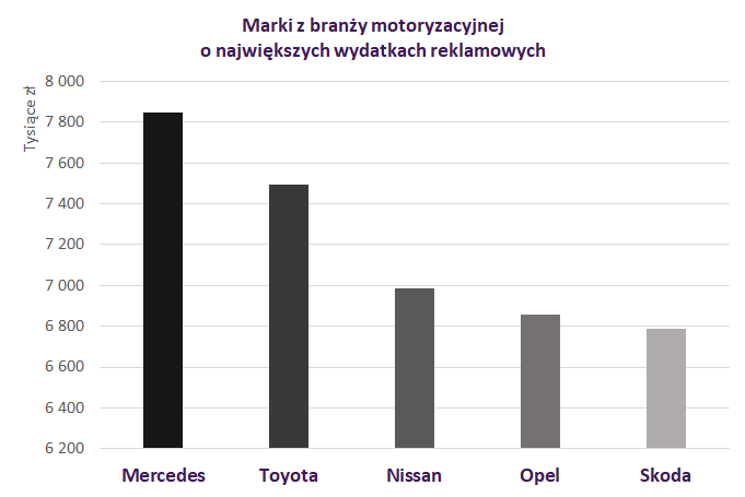 W czerwcu w pierwszej piątce marek z branży motoryzacyjnej o największych wydatkach reklamowych dane IMM pokazują niewielkie różnice w budżetach, dlatego dla lepszej czytelności wykres pokazuje skalę w tysiącach złotych. Na pierwszym miejscu znalazł się Mercedes, a tuż za nim Toyota, Nissan, Opel oraz Skoda.