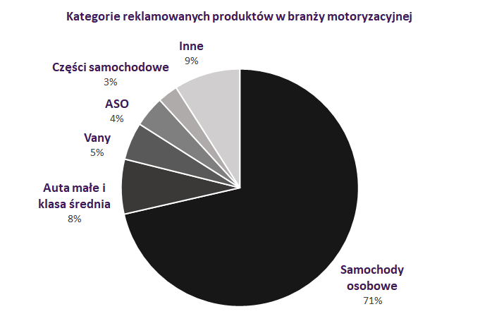 Jeśli chodzi o wydatki reklamowe przeznaczane na konkretne produkty w branży motoryzacyjnej, nadal największe udziały mają samochody osobowe (w czerwcu 71 proc.). Na kolejnych miejscach znalazły się reklamy aut małych i klasy średniej, vanów, ASO oraz części samochodowych.