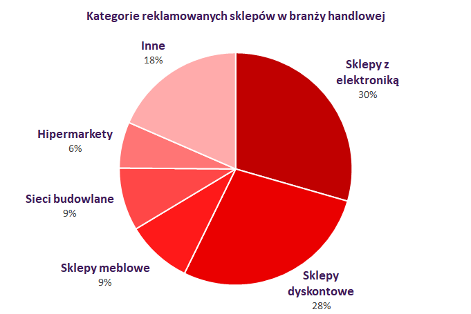 Wśród kategorii reklamowanych produktów w branży handlowej – oprócz stale obecnych z dużymi budżetami sklepów z elektroniką (30 proc.) i dyskontów (28 proc.) – pojawiły się także sklepy meblowe, sieci budowlane oraz hipermarkety.