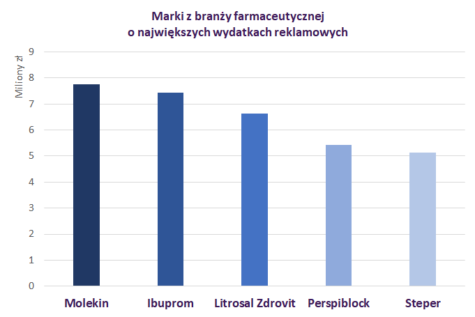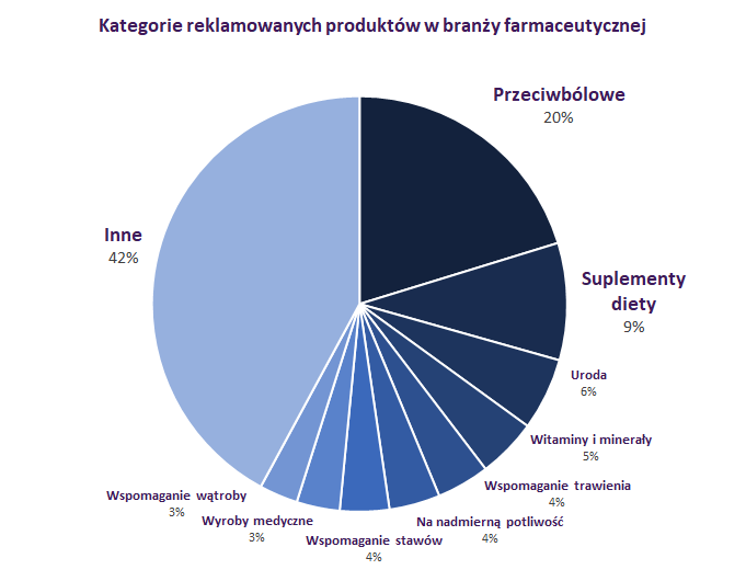 Wśród bardzo szerokiego wachlarzu produktów reklamowanych w branży farmaceutycznej największe budżety zostały przeznaczane na środki przeciwbólowe (20 proc.) oraz suplementy diety. Dalej można wymienić m.in. produkty związane z kategorią „uroda”, witaminy i minerały, a także preparaty wspomagające trawienie.