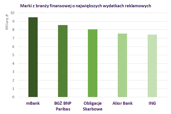 W czerwcu na pierwszym miejscu wśród marek o największych wydatkach reklamowych w branży finansowej znalazł się mBank, który przeznaczył niemal 9,5 mln zł na promocję w mediach tradycyjnych. Kolejne pozycje zajmują BGŻ BNP Paribas, Obligacje Skarbowe, Alior Bank oraz ING – wszystkie z dosyć wyrównanymi wynikami.
