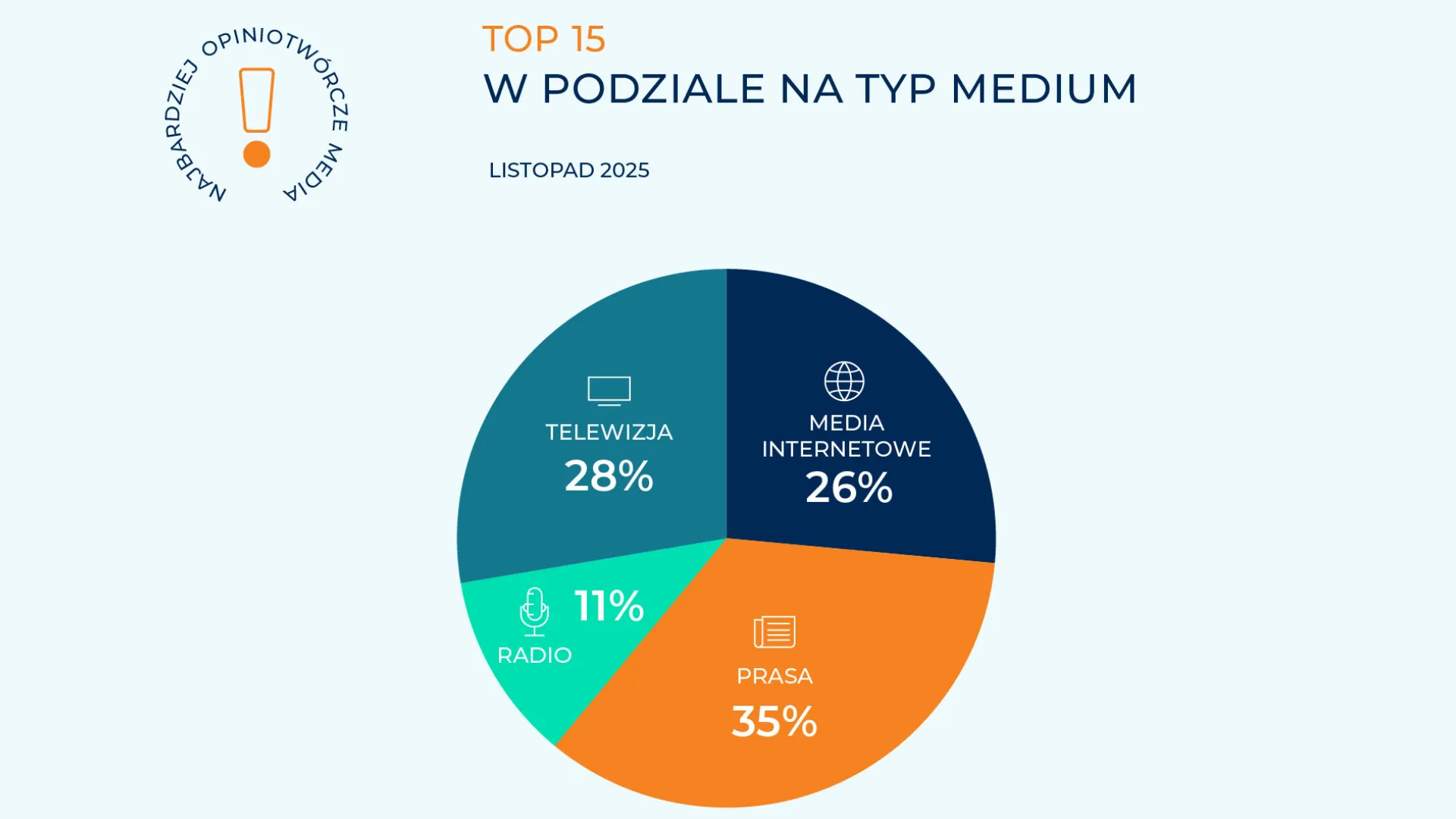 W listopadowym zestawieniu TOP 15 najbardziej opiniotwórczych mediów w Polsce największy udział – 35% – zyskała prasa („Rzeczpospolita”, „Gazeta Wyborcza”, „Fakt”, „Dziennik Gazeta Prawna”, „Super Express”). 28% udziału należy do stacji telewizyjnych (TVN24, Polsat News, TVP Sport, TVP Info, TV Republika). Udziałem wynoszącym 26% mogą pochwalić się portale internetowe (Onet, Wirtualna Polska, Interia). Najmniejszy udział – wynoszący 11% – miały stacje radiowe (RMF FM, Radio ZET).
