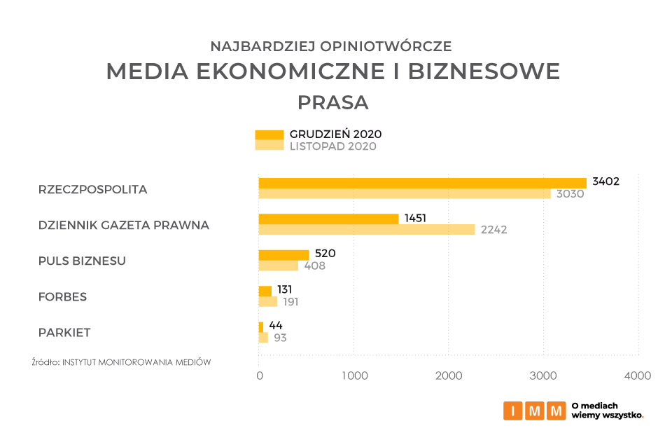 Na podium najbardziej opiniotwórczych tytułów prasowych w kategorii mediów ekonomicznych i biznesowych znalazła się Rzeczpospolita, a za nią Dziennik Gazeta Prawna cytowany 1451 razy. Miejsce trzecie podobnie jak w listopadzie zajmuje Puls Biznesu z łączną liczbą 520 cytowań.