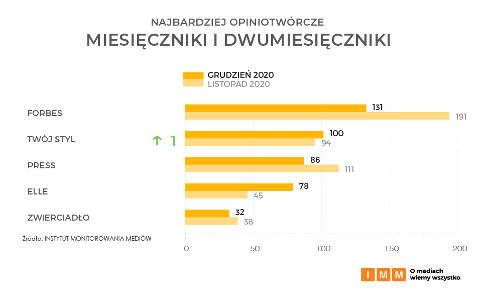 Pierwsza trójka najchętniej cytowanych miesięczników i dwumiesięczników grudnia 2020 to kolejno Forbes, Twój Styl oraz Press. Wzrost pozycji magazynu Twój Styl spowodowany jest m.in. umieszczoną na jego łamach wypowiedzią, w której wokalista Maciej Maleńczuk mówi o tym, jak pandemia pomogła mu w walce z nałogiem alkoholowym.