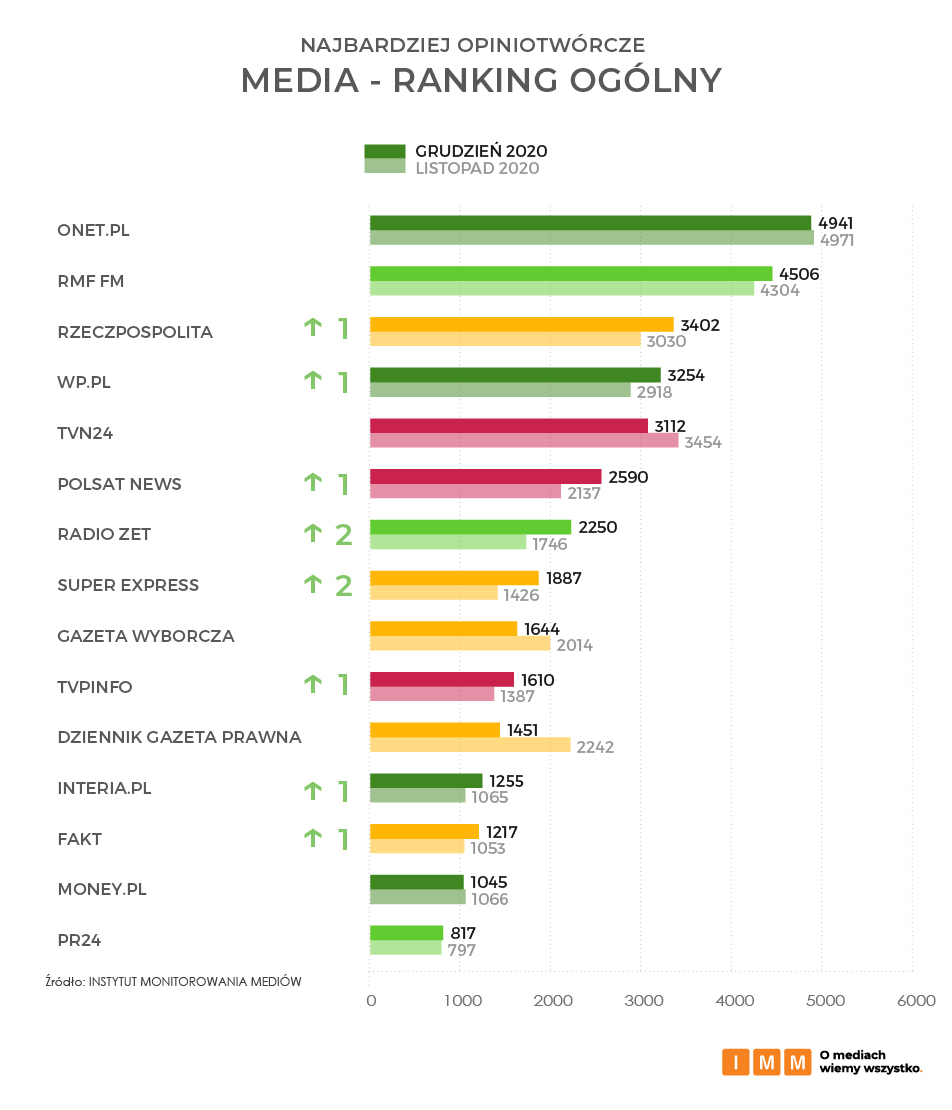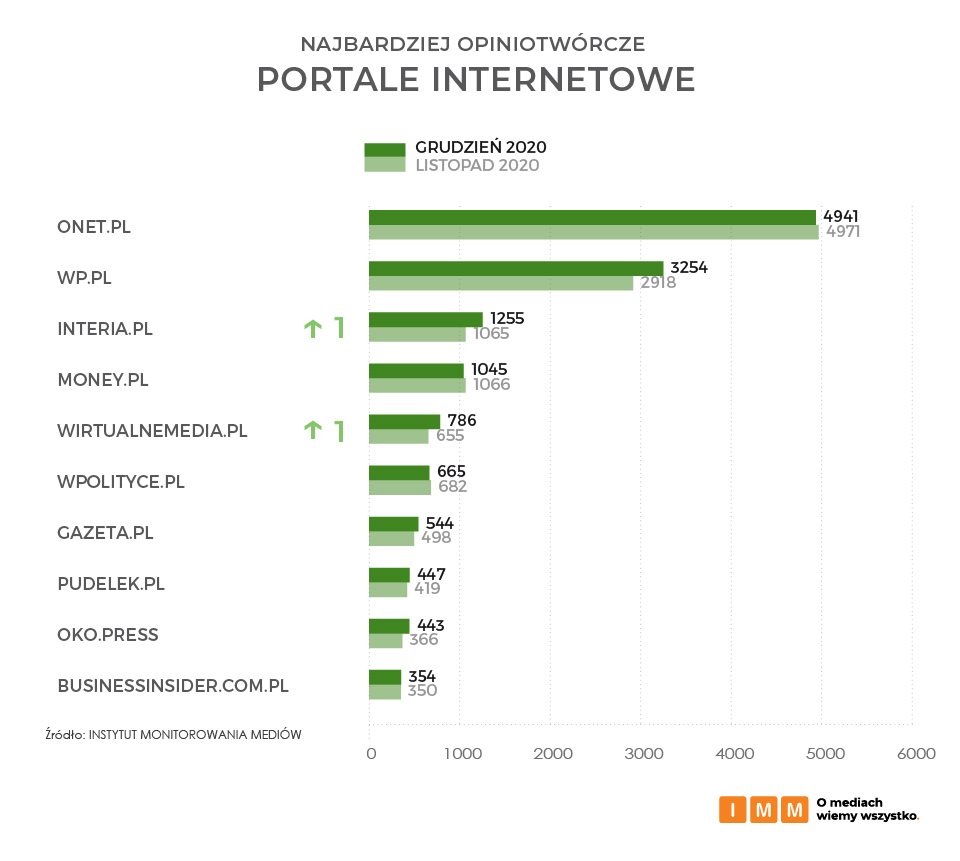 Na czele kategorii najbardziej opiniotwórczych portali internetowych grudnia 2020 znalazł się Onet.pl, a za nim kolejno Wp.pl i Interia.pl. Na miejscu piątym ze wzrostem o jedno oczko w rankingu uplasował się portal branżowy Wirtualnemedia.pl cytowany łącznie 786 razy. Na jego łamach pojawiła się informacja o zmianie funkcji dziennikarza Edwarda Miszczaka w telewizji TVN.