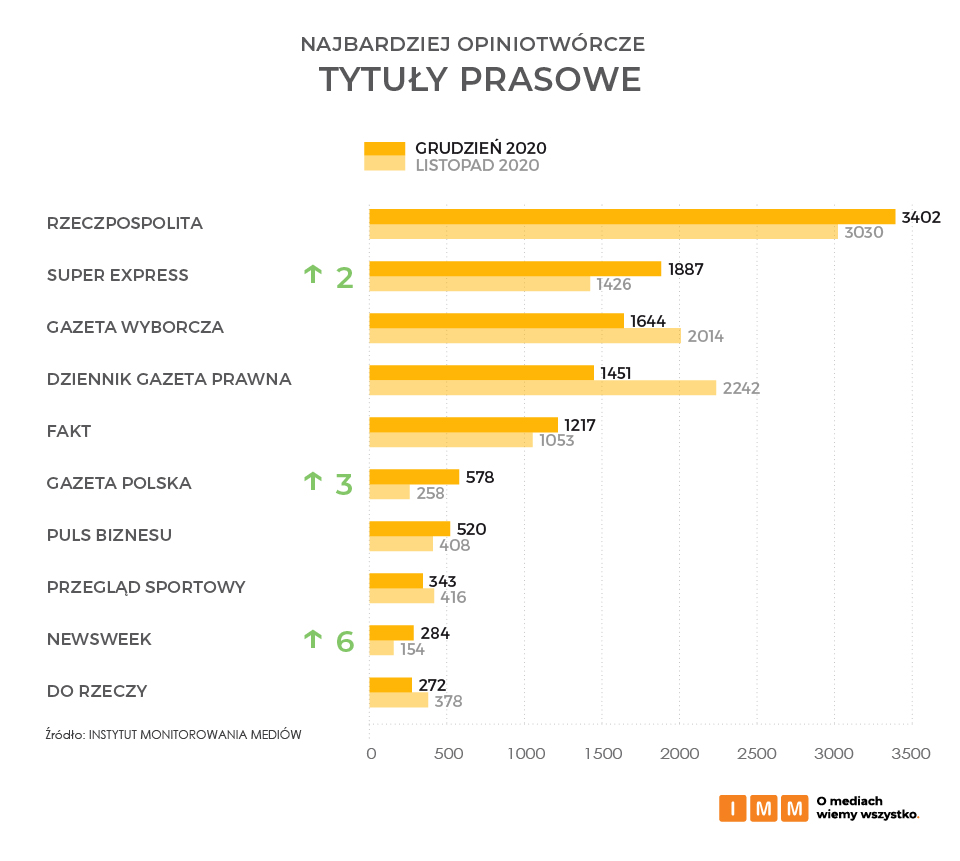 W kategorii najczęściej cytowanych tytułów prasowych w grudniu 2020 na pierwszym miejscu niezmiennie znalazła się Rzeczpospolita, na której informacje inne media powoływały się 3402 razy. Ze wzrostem o dwie pozycje w rankingu kolejne miejsce na podium zajął tytuł Super Express, a za nim uplasowała się Gazeta Wyborcza z wynikiem 1644 cytowań. Na miejscu szóstym znalazł się natomiast tytuł Gazeta Polska, gdzie wywiadu udzielił prezes PiS, Jarosław Kaczyński. Aż o sześć oczek wyżej w stosunku do listopada uplasował się Newsweek, gdzie były premier Donald Tusk wypowiadał się o działaniach partii rządzącej w stosunku do Unii Europejskiej.