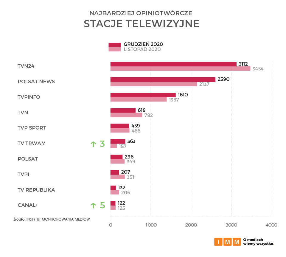 Podium najbardziej opiniotwórczych stacji telewizyjnych w grudniu 2020 otwiera TVN24, cytowany łącznie 3112 razy. Za nim na drugim miejscu znalazł się Polsat News z wynikiem 2590 wzmianek, a następne w rankingu TVP Info uzyskało wynik 1610 cytowań. O trzy pozycje wyżej w porównaniu do ubiegłego miesiąca znalazła się telewizja TV Trwam, gdzie wypowiadał się Zbigniew Ziobro. Do grudniowego rankingu zakwalifikowała się również stacja Canal +, gdzie po meczu Wisły z Cracovią wypowiadali się Janusz Filipiak i Michał Probierz, kolejno prezes i trener klubu Cracovia.