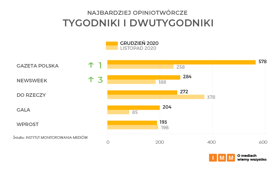 Pierwsze miejsce kategorii najbardziej opiniotwórczych tygodników i dwutygodników w Polsce zajął tytuł Gazeta Polska z liczbą 578 cytowań. Za nią uplasował się Newsweek, a podium zamyka tytuł Do Rzeczy, cytowany 272 razy.