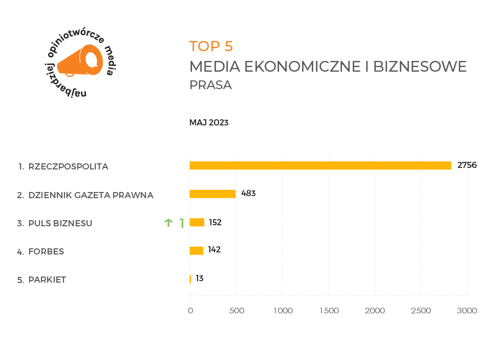 Na podium najbardziej opiniotwórczych tytułów prasowych o profilu ekonomiczno–biznesowym niezmiennie utrzymuje się Rzeczpospolita (2,7 tys.). Kolejne miejsce podobnie jak w zeszłym miesiącu zajmuje Dziennik Gazeta Prawna (483), a podium ze wzrostem o jedno oczko należy do Pulsu Biznesu (152). Kolejne miejsca w zestawieniu zajęli Forbes (142) i Parkiet (13).