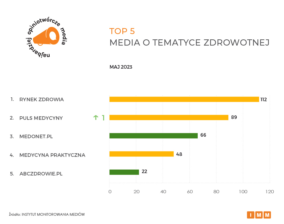 Pozycję lidera utrzymuje kwartalnik Rynek Zdrowia, na który dziennikarze powoływali się w maju 112 razy. Redakcja między innymi jako pierwsza opublikowała informacje o zmianach w przepisach, które umożliwiają w określonych przypadkach dostać się do psychologa bez skierowania. Miejsce drugie należy do Pulsu Medycyny (89 cytowań), a podium zamyka Medonet (66). W TOP 5 znalazł się także miesięcznik Medycyna Praktyczna wzmiankowany przez inne media 48 razy oraz portal AbcZdrowie mający 22 cytowania.