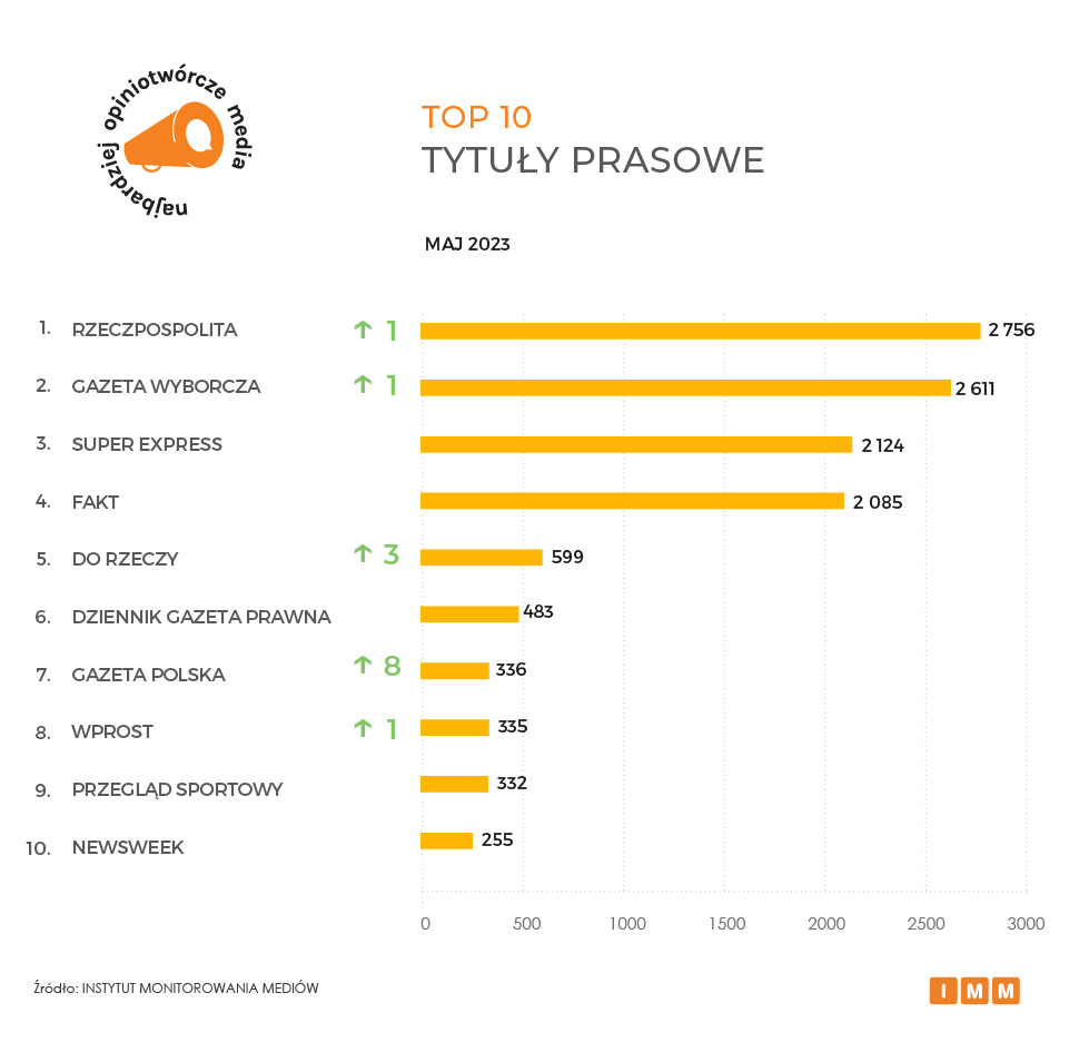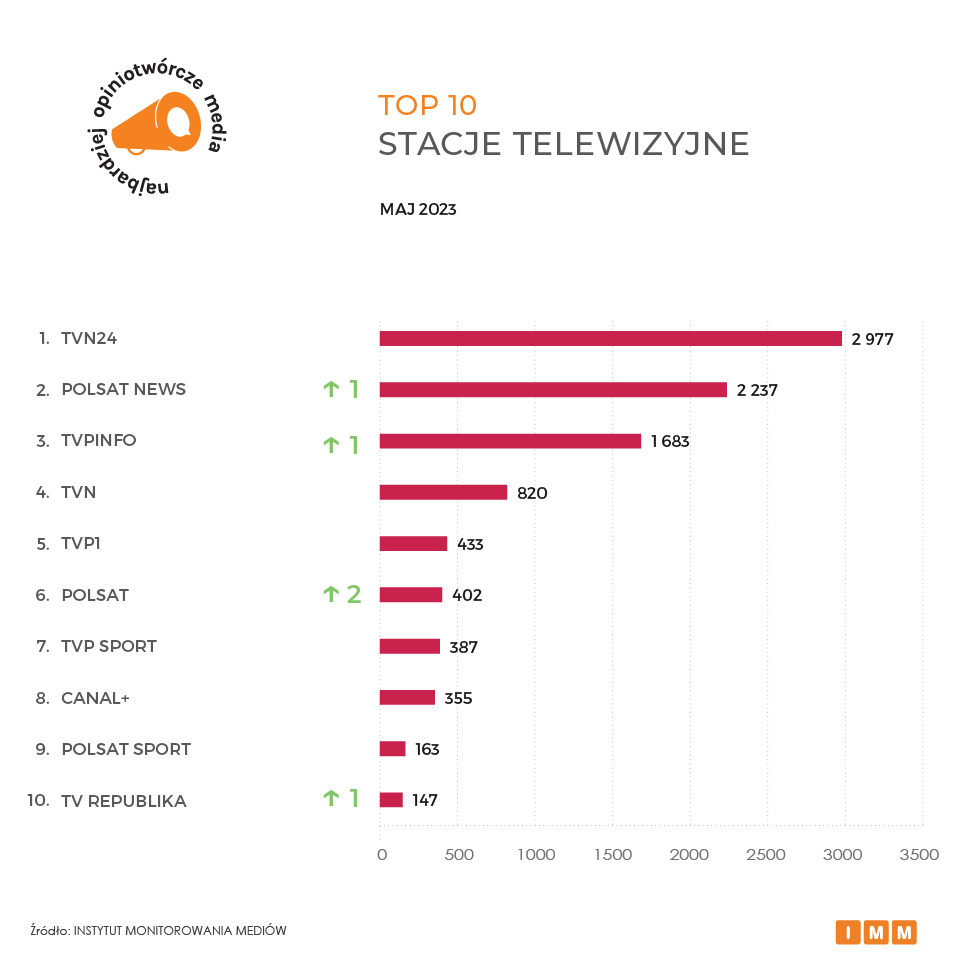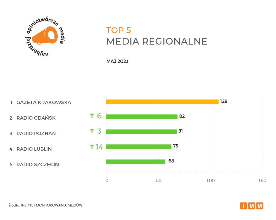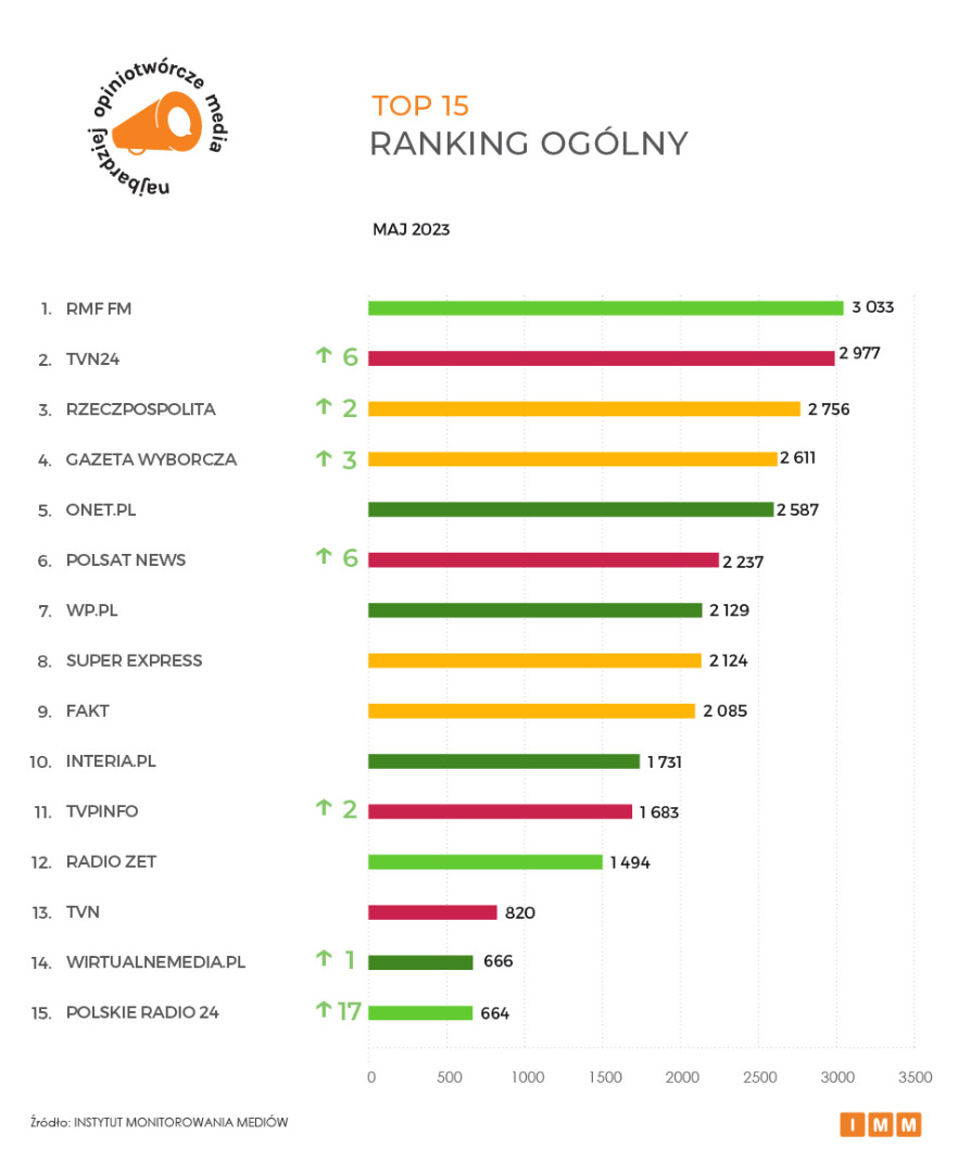 Jak podaje Instytut Monitorowania Mediów (IMM), na czele najbardziej opiniotwórczych mediów utrzymuje się RMF FM, do którego informacji inne redakcje w kraju odwoływały się w maju ponad 3 tys. razy. Następną pozycję zajmuje stacja TVN24, na którą polskie media powoływały się zaledwie 56 razy mniej. Podium zamyka dziennik Rzeczpospolita z wynikiem 2,7 tys. cytowań. Z kolei najwyższy awans aż o siedemnaście miejsc w rankingu głównym należy do Polskiego Radia 24.