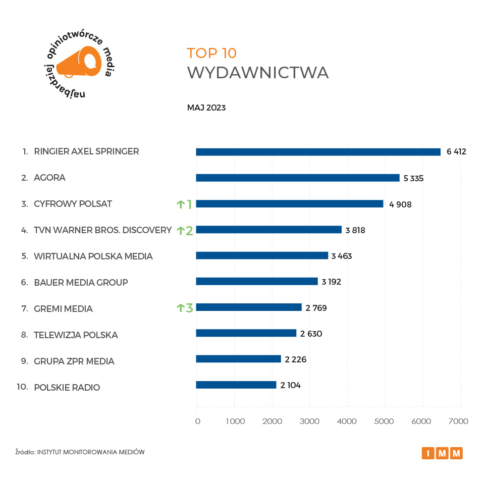Na pozycji lidera rankingu najbardziej opiniotwórczych wydawnictw utrzymuje się Ringier Axel Springer, której redakcje monitorowane w ramach badania (Business Insider, Fakt, Forbes, Newsweek, Noizz, Onet, Plejada i Przegląd Sportowy) łącznie były cytowane przez dziennikarzy innych mediów w Polsce ponad 6,4 tys. razy. Na drugim miejscu jest Agora z łącznym wynikiem 5,3 tys. wzmianek dla tytułów z raportu Radio Zet, Gazeta Wyborcza, Gazeta.pl, Plotek, Sport.pl oraz TOK FM. Z awansem o jedną pozycję podium zamyka Cyfrowy Polsat (Interia, Polsat News, Polsat, Polsat Sport, Pomponik, TV4), której materiały redakcyjne łącznie pojawiły się ponad 4,9 tys. razy w innych tytułach mediowych w kraju.