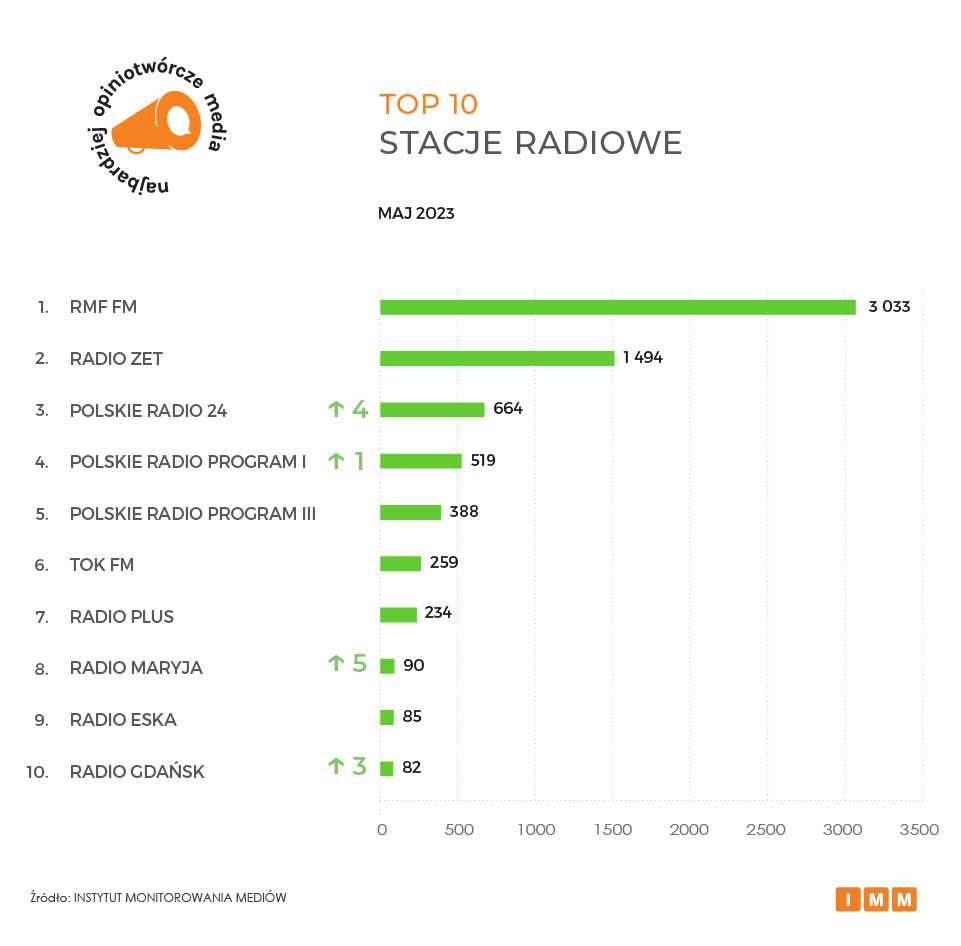 Radio RMF FM pozostaje najbardziej opiniotwórczą rozgłośnią radiową w Polsce – w maju inne media powoływały się na redakcyjne treści stacji ponad 3 tys. razy. Drugie miejsce należy do Radia Zet, które dziennikarze innych tytułów w kraju cytowały blisko 1,5 tys. razy. Redakcja stacji przeprowadziła między innymi wywiad z Marcinem Przydaczem szefem prezydenckiego Biura Polityki Międzynarodowej, który poinformował o zwołaniu przez Andrzeja Dudę narady BBN w związku z przygotowaniami do szczytu NATO w Wilnie. Podium natomiast z awansem o cztery oczka zamyka Polskie Radio 24(664 wzmianki). Awanse w zestawieniu odnotowały stacje Radio Maryja (90) oraz Radio Gdańsk (82).