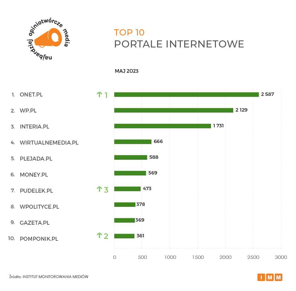 Na pierwsze miejsce wśród najbardziej opiniotwórczych portali internetowych w Polsce powraca Onet z liczbą 2,5 tys. odwołań. W maju redakcja opublikowała między innymi głośny reportaż Janusza Schwertnera „Odór” dotyczący Pawła Siennickiego, członka zarządu Polskich Portów Lotniczych S.A., który miał szantażować i nękać swoją byłą partnerkę. Na wskutek opublikowanego materiału podał się on tego samego dnia do dymisji. Drugie miejsce zajmuje Wirtualna Polska z liczbą ponad 2,1 tys. wzmianek w innych tytułach. Dziennikarz WP Szymon Jadczak ujawnił wówczas nowe szczegóły swojego śledztwa w sprawie olbrzymiej dotacji z NCBiR dla firmy z Białegostoku. Podium ponownie zamyka Interia (1,7 tys.), w której opublikowano wywiad z trenerem polskiej kadry w skokach narciarskich Thomasem Thunrbichlerem. Były skoczek opowiedział w nim o czekających go wyzwaniach przy doprowadzeniu do szczytowej formy najlepszych polskich skoczków. Wzrost o trzy pozycje odnotował portal Pudelek, który z wynikiem 473 cytowań uplasował się na siódmym miejscu, natomiast TOP10 z awansem o dwie pozycje zajmuje Pomponik (361).