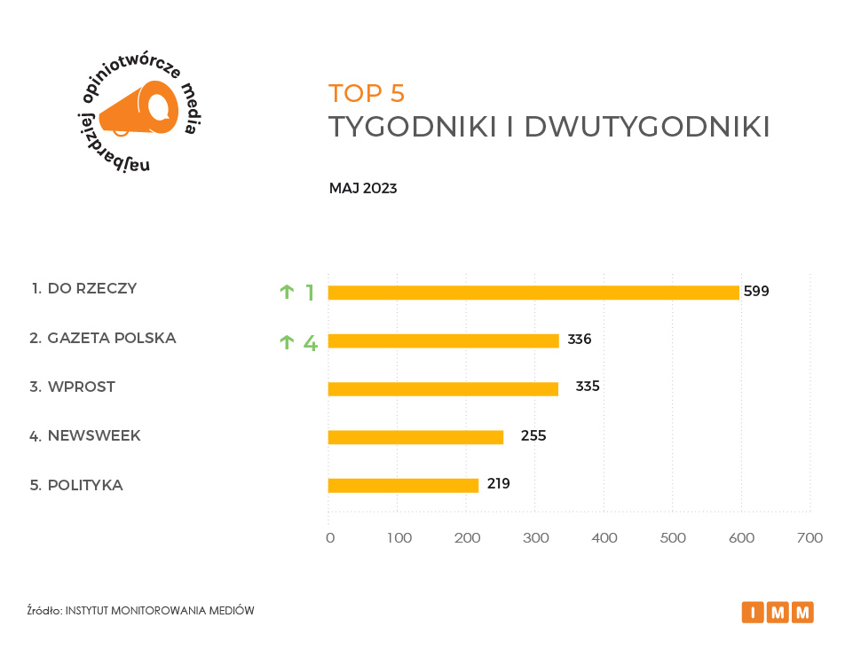 Na pierwszym miejscu rankingu najbardziej opiniotwórczych tygodników i dwutygodników znalazło się Do Rzeczy – w maju gazeta odnotowała awans o jedną pozycję z liczbą blisko 600 cytowań w innych mediach. Na łamach miesięcznika ukazał się między innymi wywiad z ministrem sprawiedliwości Zbigniewem Ziobrą, który skrytykował podejmowane decyzje premiera Mateusza Morawieckiego w najważniejszych sprawach dotyczących UE. Miejsce drugie należy do dwutygodnika Gazeta Polska wzmiankowanego wówczas 336 razy. Podium natomiast zamyka Wprost z liczbą 335 cytowań w innych tytułach. Na miejscu czwartym uplasował się Newsweek (255), a ranking zamyka Polityka (219).