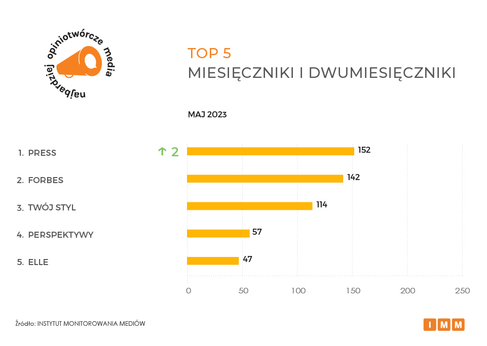 Ranking najbardziej opiniotwórczych miesięczników i dwumiesięczników otwiera Press z liczbą 152 odwołań w innych mediach. Redakcja poinformowała między innymi o zdjęciu z anteny radiowej piosenki „Marcepan” z repertuaru Sanah. Według Arkadiusza Wojciechowskiego, szefa rozgłośni jest sprzeczna z polskim prawem, ponieważ zakazuje ono promowania na antenie wyrobów tytoniowych. Za nim miejsce drugie zajmuje Forbes, który w maju cytowano 142 razy. Podium zamyka miesięcznik dla kobiet Twój Styl wzmiankowany przez pozostałe redakcje 114 razy. Miejsce czwarte zajmuje miesięcznik młodzieży Perspektywy (57), a zestawienie zamyka Elle (47).