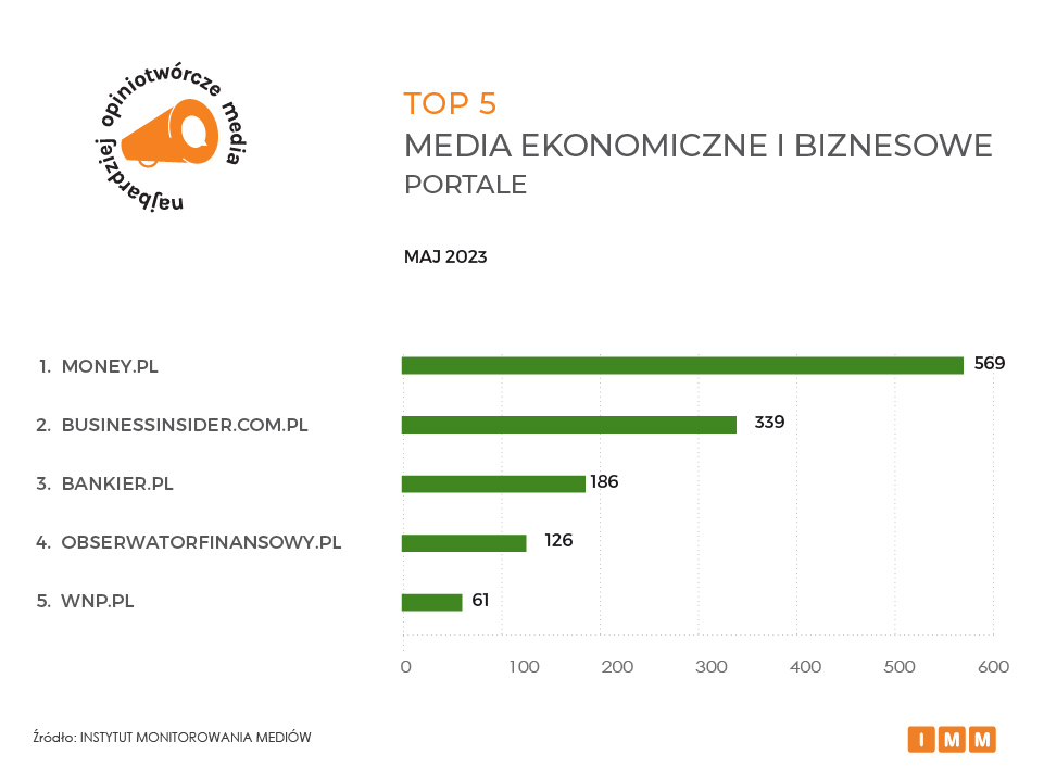 Na pierwszym miejscu w zestawieniu portali biznesowych utrzymuje się Money (569 wzmianek). W maju portal przeprowadził wywiad z Ludwikiem Koteckim z Rady Polityki Pieniężnej, który potwierdził, że zapowiadane dodatkowe wydatki socjalne oddalają obniżki stóp procentowych co najmniej do końca 2025 r. Dalej Business Insider z liczbą 339 cytowań, a miejsce trzecie zajmuje Bankier (186). Na czwartym znalazł się portal Obserwator finansowy, do którego publikacji w maju odwoływano się łącznie 126 razy. TOP 5 zamyka WNP z liczbą 61 powołań w innych mediach w Polsce.