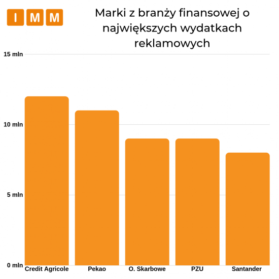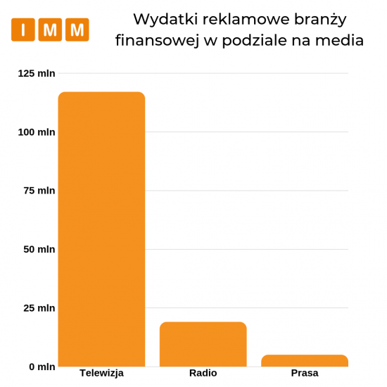 Branża finansowa największe budżety przeznaczyła na reklamę w telewizji, na którą przeznaczono 117,1 mln zł. W reklamę radiową zainwestowano 19,4 mln zł. Najmniejsze kwoty przeznaczono na reklamę w prasie –4,8 mln zł.