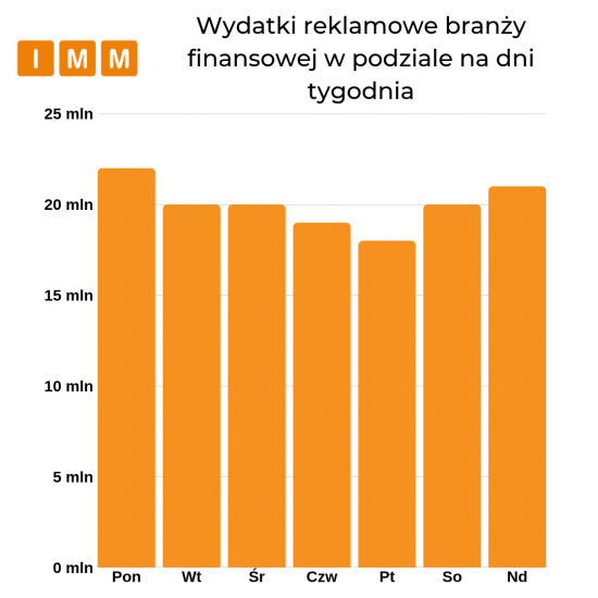 W czerwcu największe budżety reklamowe branży finansowej lokowane były w poniedziałki i niedziele – wyniosły w sumie 43 mln zł. Najniższe wydatki reklamowe zostały zanotowane w piątki – ok. 18,4 mln zł.