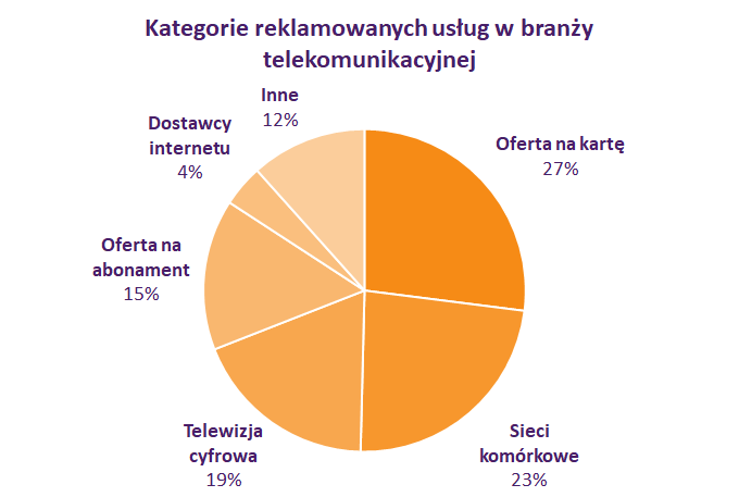 W branży komunikacyjnej większość lipcowych reklam dotyczyła oferty na kartę (27 proc.). Dalej zmonitorowano sieci komórkowe, telewizję cyfrową, oferty na abonament i reklamy dostawców internetu.