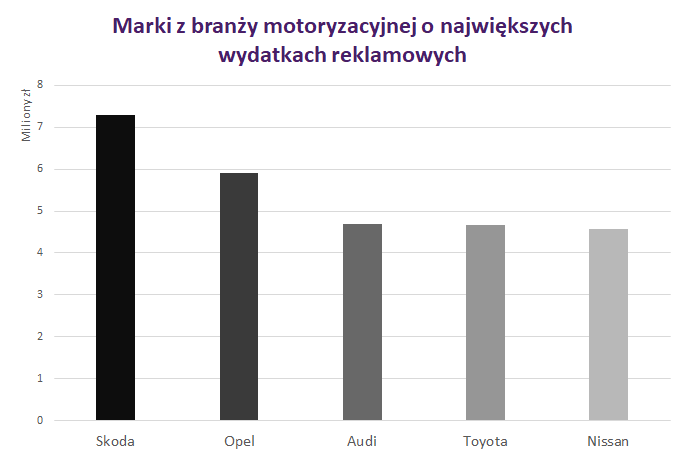 W lipcu w pierwszej piątce marek motoryzacyjnych na pierwszym miejscu znalazła się Skoda (ponad 7 mln zł), a tuż za nią Opel, Audi, Toyota oraz Nissan.