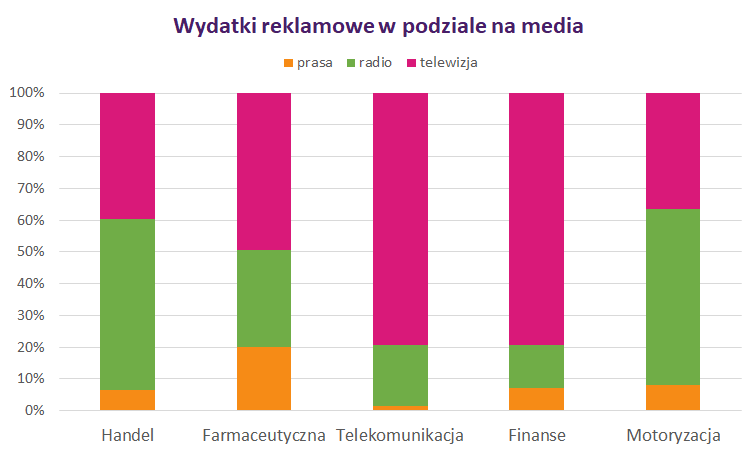 Największe wydatki w przeanalizowanych branżach nadal pochłaniane są przez reklamy telewizyjne (około 40 proc. w każdej dziedzinie), natomiast najmniejsze budżety przeznaczane są na promocję w prasie. Branża handlowa najchętniej inwestuje w spoty radiowe (54 proc. budżetu).