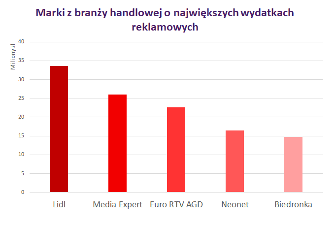 Nadal największym budżetem reklamowym może pochwalić się Lidl, który w lipcu przeznaczył ponad 33,5 mln zł na promocję w mediach tradycyjnych. Na kolejnych miejscach znalazły się sklepy Media Expert, Euro RTV AGD, Neonet oraz Biedronka.
