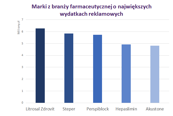 W lipcu marka Litrosal Zdrovit wygenerowała największe wydatki w branży farmaceutycznej – nieco ponad 6 mln zł na reklamę w mediach tradycyjnych. Na kolejnych miejscach z nieco mniejszymi wynikami znalazły się Steper, Perspiblock, Hepaslimin oraz Akustone.