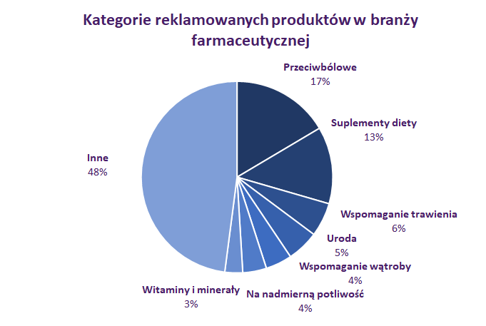 Wśród bardzo szerokiego wachlarzu produktów reklamowanych w branży farmaceutycznej największe budżety zostały przeznaczane na środki przeciwbólowe (17 proc.) oraz suplementy diety (13 proc.). Dalej można wymienić m.in. produkty wspomagające trawienie, związane z pielęgnacją i wspomagające wątrobę.