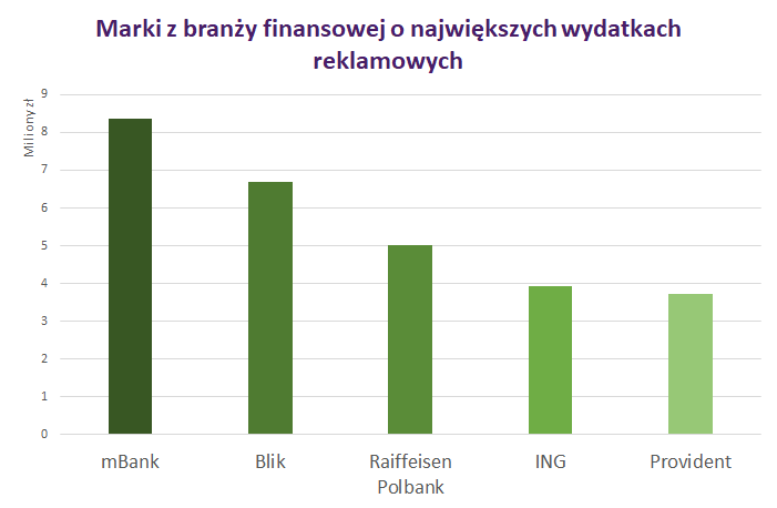 W lipcu na pierwszym miejscu wśród marek o największych wydatkach reklamowych w branży finansowej znalazł się mBank, który przeznaczył ponad 8 mln zł na promocję w mediach tradycyjnych. Kolejne pozycje zajmują Blik Polskiego Standardu Płatności, Raiffeisen Polbank, ING oraz Provident.